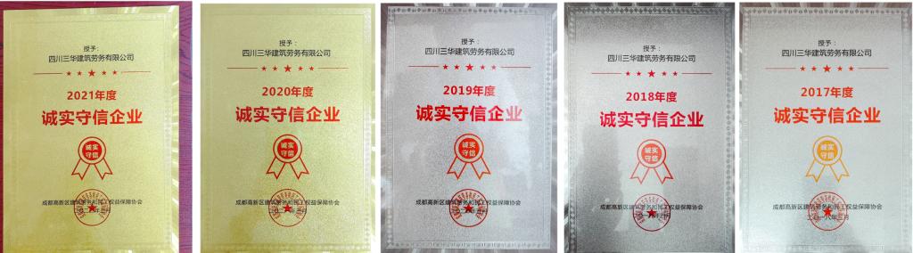 2017年,三华劳务加入了成都高新区建筑劳务和民工权益保障协会,并成为协会理事单位,连续六年荣获“诚实守信企业”称号。