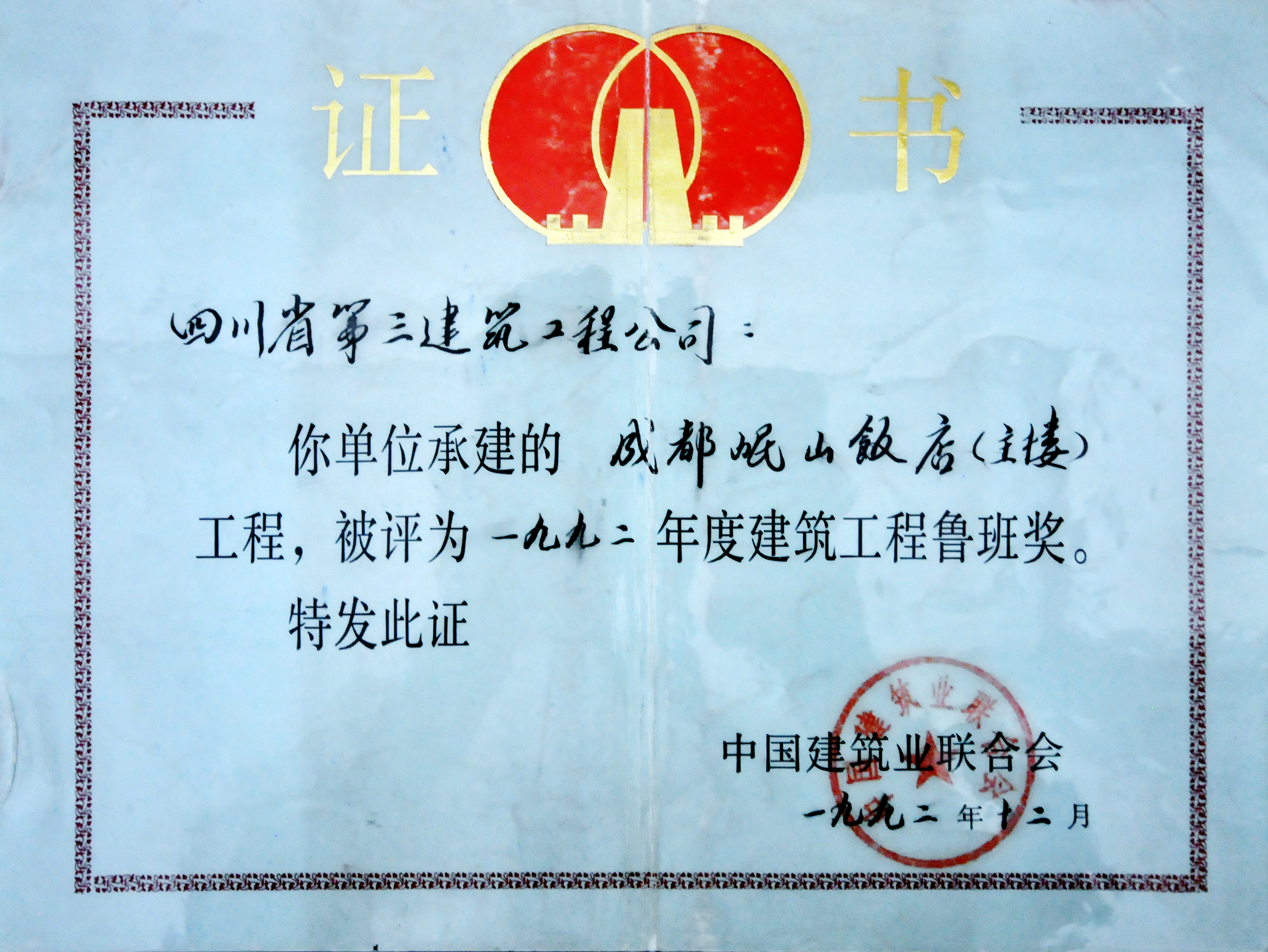 成都岷山饭店主楼被评为中国建设鲁班奖