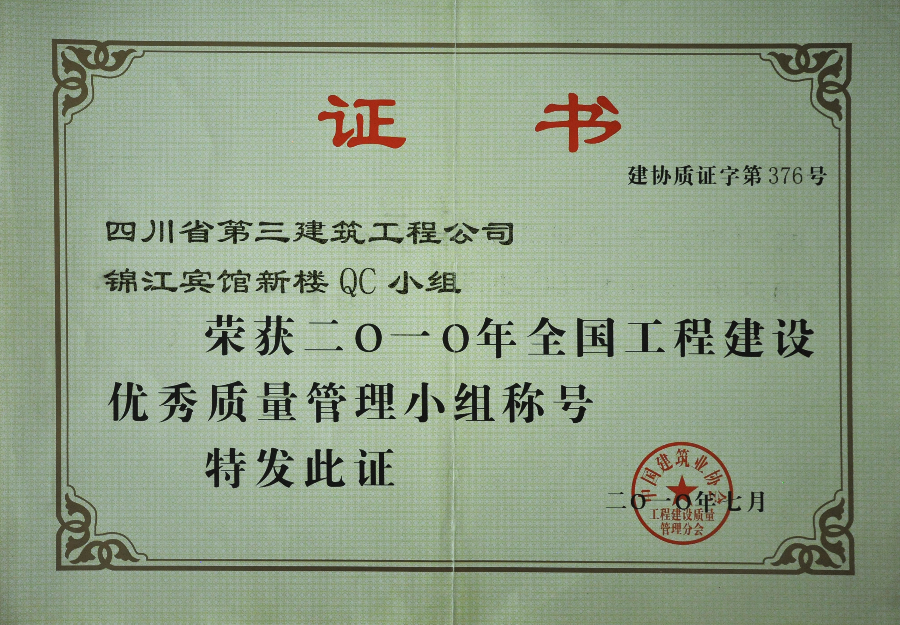 锦江宾馆新楼QC小组荣获2010年全国工程...