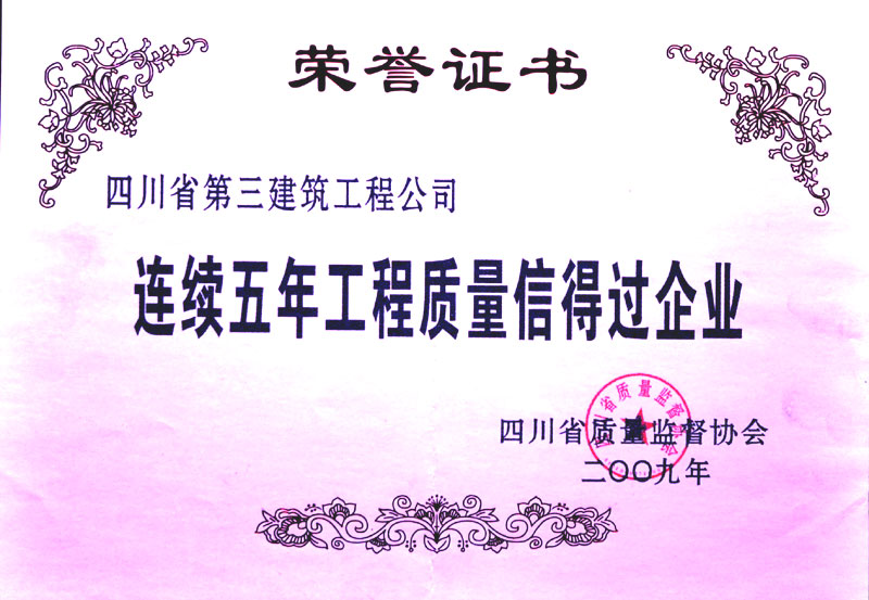 连续五年工程质量信得过企业荣誉证书
