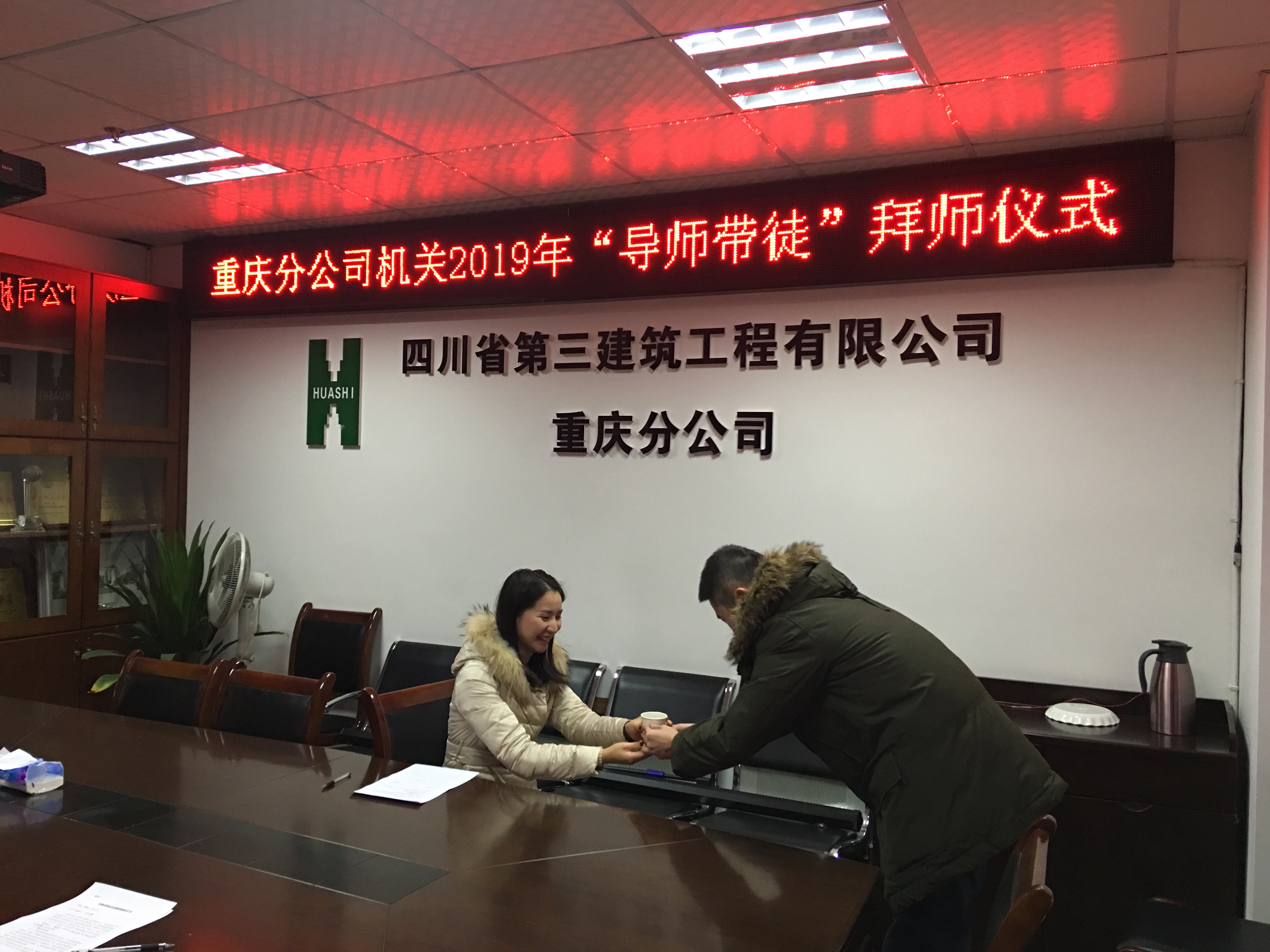为认真践行公司“导师带徒”人才培养机制,弘扬“尊师重教”优良传统,进一步加强人才队伍建设,近日,重庆分公司举行了“导师带徒”拜师仪式。 拜师仪式上,分公司团总支书记及项目经理代表从“关键在师、行动在徒、...