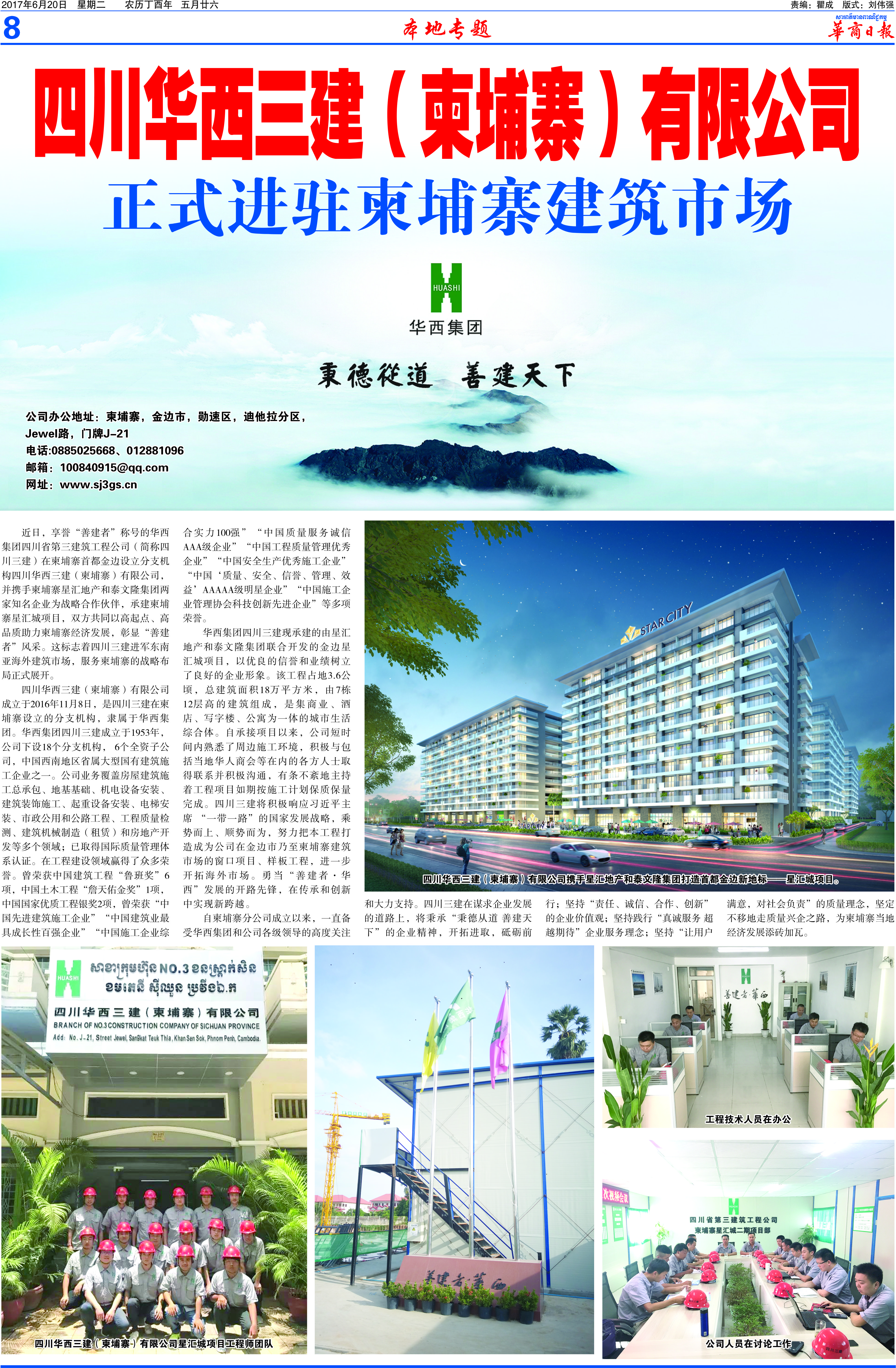 由二分公司承建的金边星汇城项目,是由星汇地产和泰文隆集团两家柬埔寨知名企业联合打造的首都金边新地标。自项目承建以来,一直备受当地华人等各方人士的关注,在四川华西三建(柬埔寨)有限公司成立之初,《华商日...