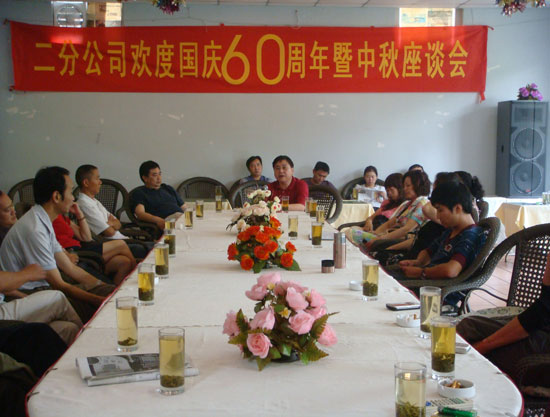 二分公司 “喜迎新中国60华诞暨中秋”座谈会 国庆前夕,二分公司全体职工在温江仁和春天大道项目青田休闲度假村召开了“喜迎新中国60华诞暨中秋”座谈会。会上,分公司领导班子及新老职工畅谈了新中国成立60年来社会...