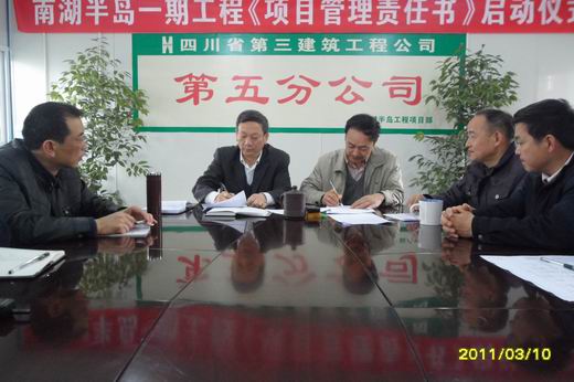 第五分公司南湖半岛一期项目部 签订《项目管理责任书》 3月11日,第五分公司在华阳南湖半岛一期项目进行了《项目管理责任书》的签书仪式。南湖半岛一期项目经理唐代远与第五分公司经理阮思全签订了《项目管理责任书...