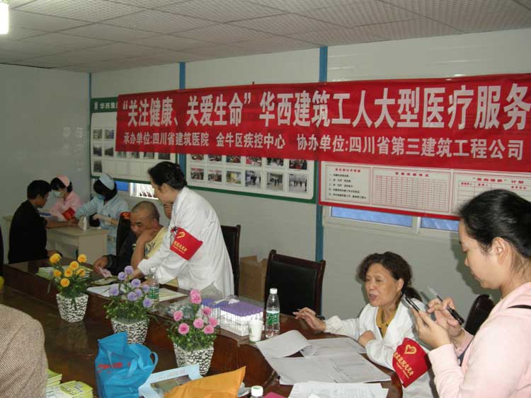 ---公司联合建筑医院开展大型医疗服务活动 为普及健康知识,提高农民工自我保健意识和能力,五月十七日,由建筑医院和疾控中心专家学者和医生护士到我公司光华逸家工地现场为一分司、二分司的农民工兄弟义务开展以“...